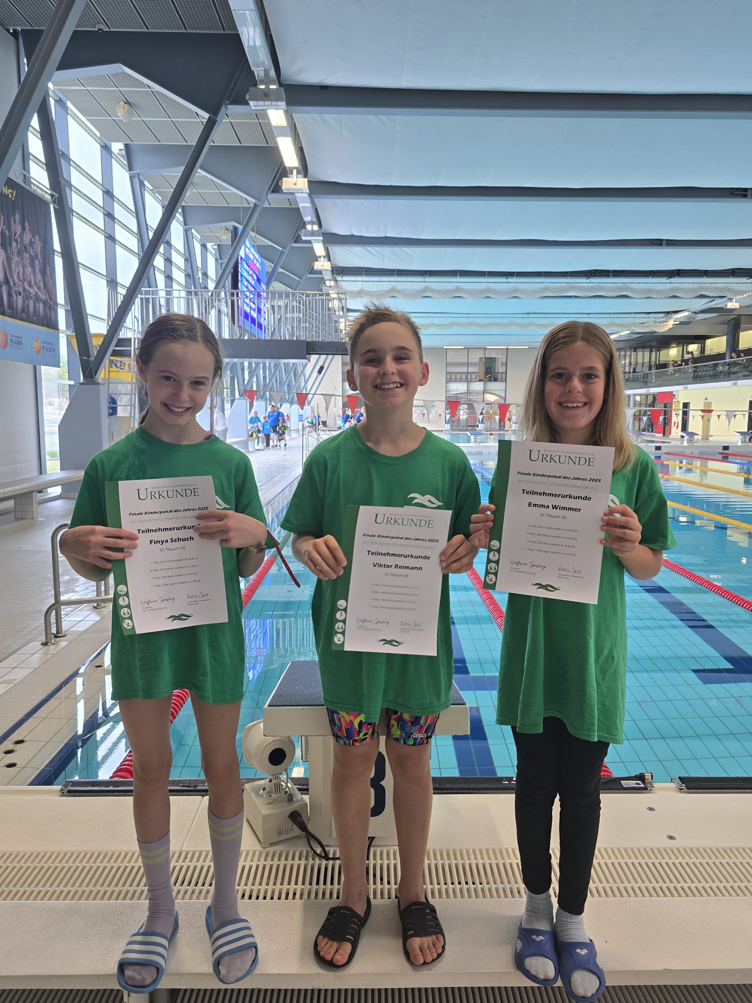 Am Sonntag stand dann das Finale des Kinderpokals des Sächsischen Schwimmverbandes auf dem Programm. Dieser Wettbewerb wurde über die gesamte Saison 2024/2025 durchgeführt. Startberechtigt waren für unseren Verein als Finalisten Emma, Finya und Viktor, die den Einzug unter die 20 besten Schwimmer der jeweiligen Altersklasse geschafft hatten. Das Finale bestand aus drei verschiedenen Schwimmartenstrecken und einem Lagenwettbewerb. Deren Ergebnisse wurden mit Punktwerten versehen und summiert. Ganz nach vorn reichte es für Emma, Finya und Viktor leider bei der starken Konkurrenz nicht, aber alle schwammen nochmals tolle Bestzeiten an diesem anstrengenden zweiten Wettkampftag.
